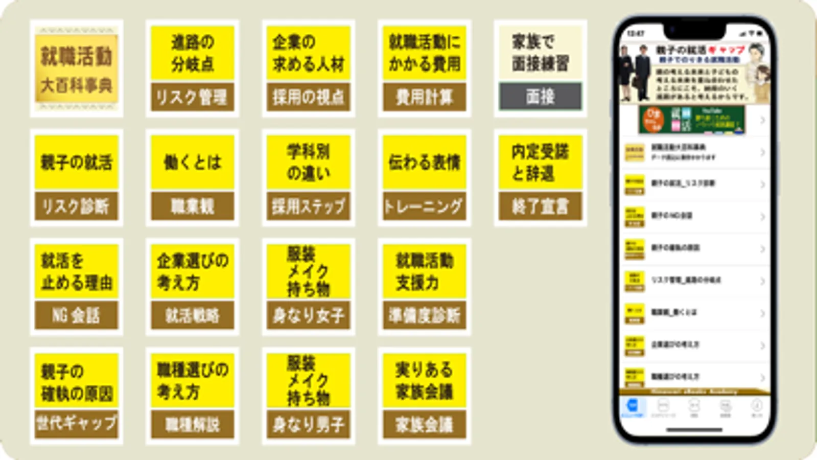 親子のNG会話、進路選びのリスク、働くとは、企業選びの考え方、職種選びの考え方、企業の求める人材、学科別採用ステップ、費用、服装、内定受託と辞退など