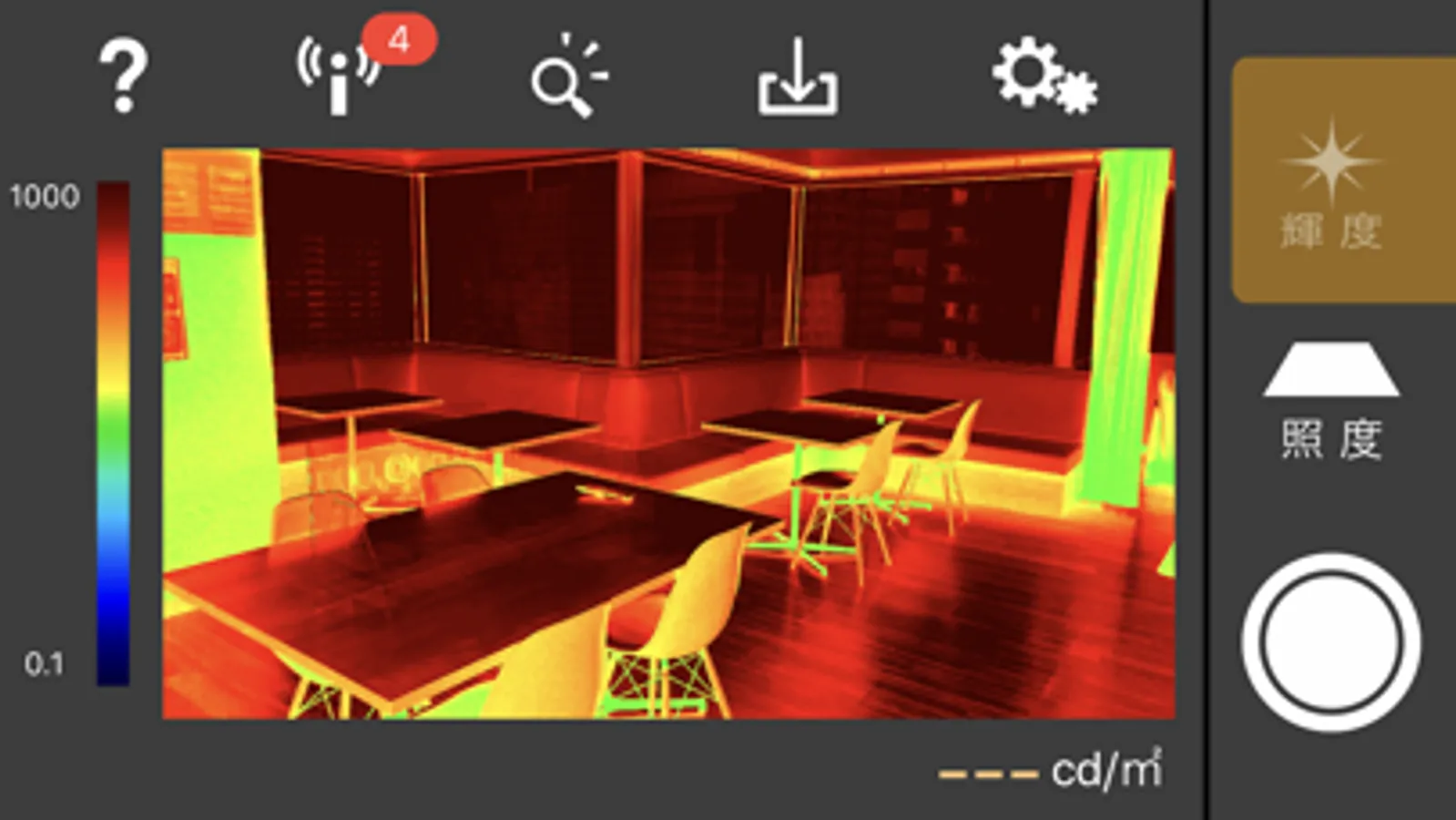 「輝度」はカラー解析画像として表示され、タップした位置の輝度を知ることができます。