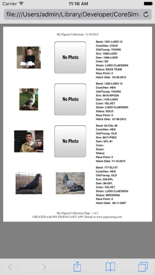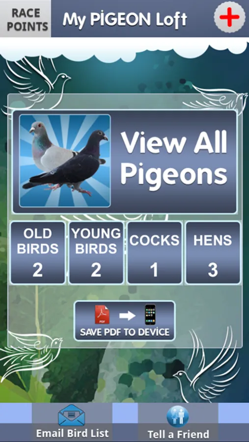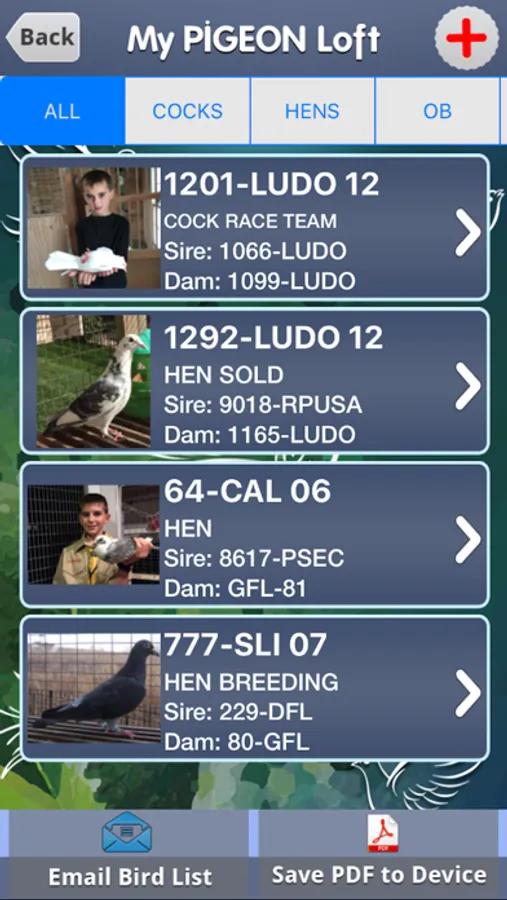 My Pigeon Loft is a Pigeon Loft Organizer to keep track of all birds in your inventory. You can sort your birds for viewing, emailing, or PDF file based on selected criteria: Hen/Cock/Old Bird/Young Bird/Sire/Dam/Band#/Status/Points. You can attach 2 photos for each bird entered. App allows you to take photo in-app or to select from your device saved photos.