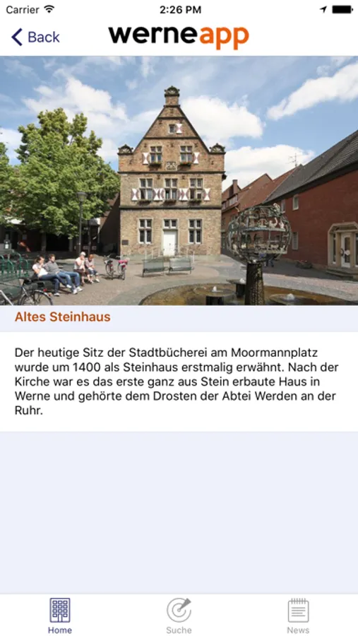 Die App ist randvoll mit allem, was Werne an der Lippe zu bieten hat: Vorstellung der Stadt mit ihrem historischen Stadtkern, den Sehenswürdigkeiten, den Kirchen und dem Stadtmuseum, Freizeitangebote für Groß und Klein, Sportangebote von Fahrradtouren in die Umgebung über Schwimmen bis zu Golfen und vielem mehr, größtenteils mit Öffnungszeiten und Preisangaben.