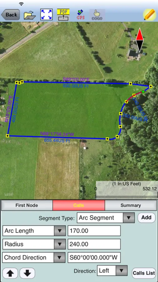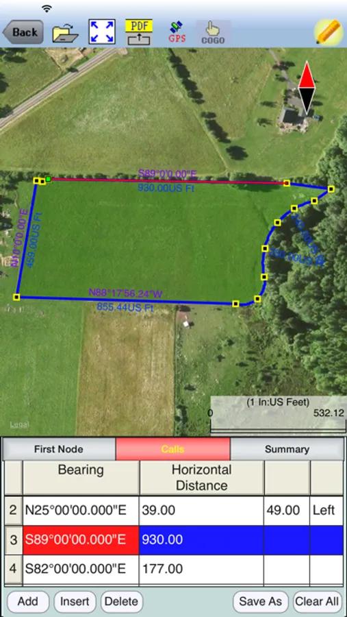 The Deed Calls function will let you specify the starting point, orientation angle and units of measure, and the app will draw the property boundary as you enter the angles and distances. It will display the angles and distances as well as the closure error, total area and perimeter.