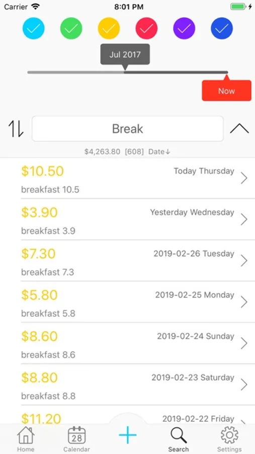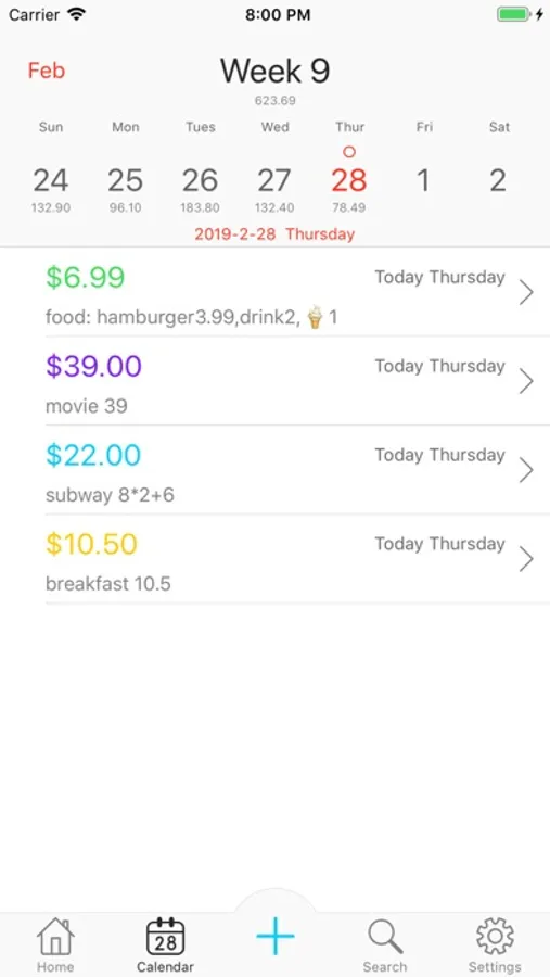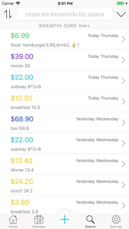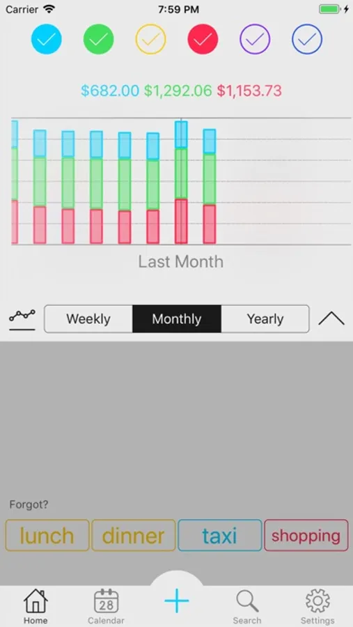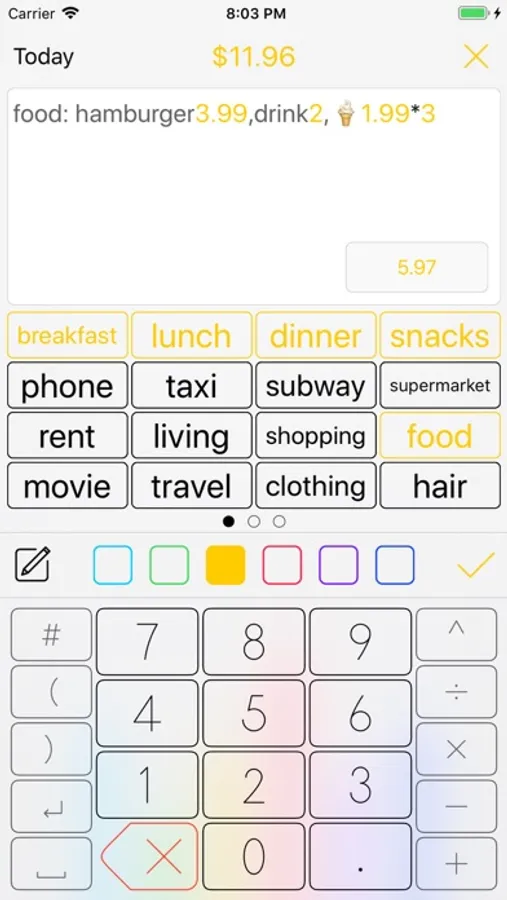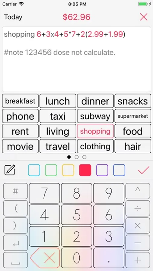 2.It has no complex types like other traditional accounting app,but only the color type, user can define their own types for colors, such as green for food consumption, and blue represents traffic consumption and so on;