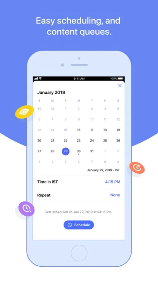 - Add posts to a publishing queue, reach out to the right audience at optimal times, and do more, with powerful scheduling features