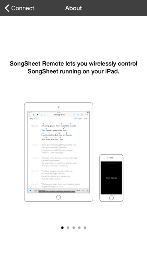 SongSheet Remote lets you wirelessly control SongSheet Pro running on your iPad. Mount your iPhone or iPod Touch running Remote directly on your guitar and forget about awkward reaches to touch your iPad’s screen!