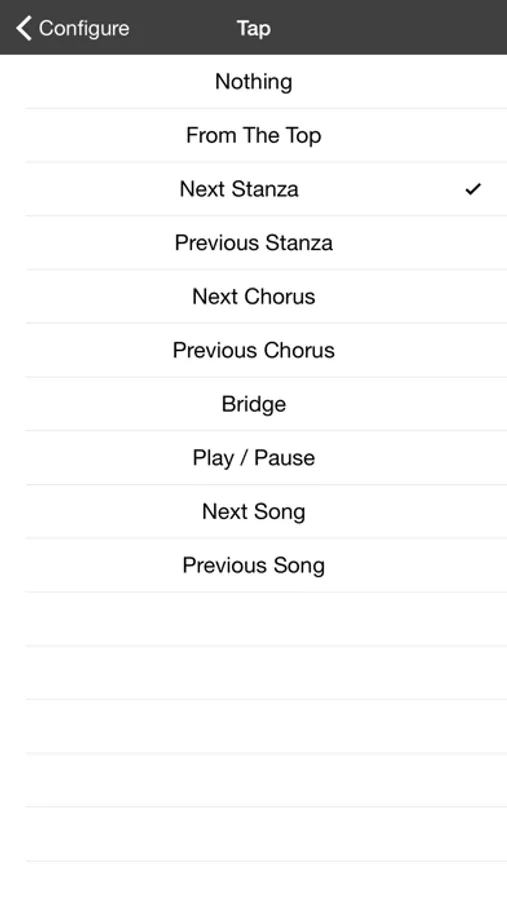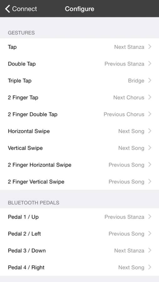 Once connected, you can use various gestures to send messages to SongSheet Pro. For example, you can step through the stanzas by tapping on your iPhone’s screen, swipe to get to the next song, and so on. If you have a Bluetooth-based controller connected to your phone (e.g. an AirTurn pedal) you can also use this to send commands via the Remote to SongSheet.