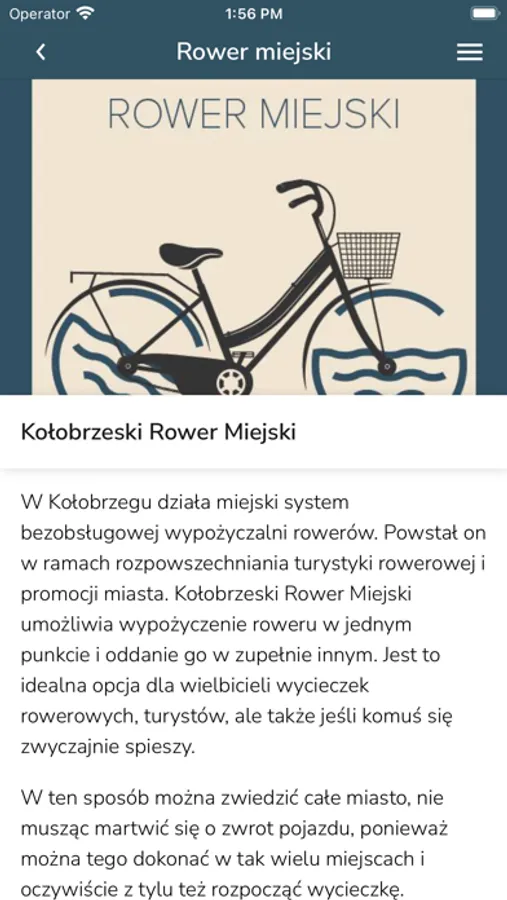 Aplikacja mobilna „Kołobrzeg RE:GENERACJA” to propozycja aktywnego przemierzania jednego z najpopularniejszych miast nadbałtyckich. W aplikacji znajdziemy najważniejsze atrakcje turystyczne miasta, a także bogatą bazę bieżących wydarzeń i artykułów o historii i specyfice Kołobrzegu. Poza paletą zabytków, które koniecznie trzeba zobaczyć, w aplikacji znajdują się również bazy gastronomiczna i noclegowa, a także wszelkie informacje praktyczne na temat obiektów sportowych i rozrywkowych. Dodatkowym atutem aplikacji są trasy turystyczne: piesze, rowerowe i kajakowe.