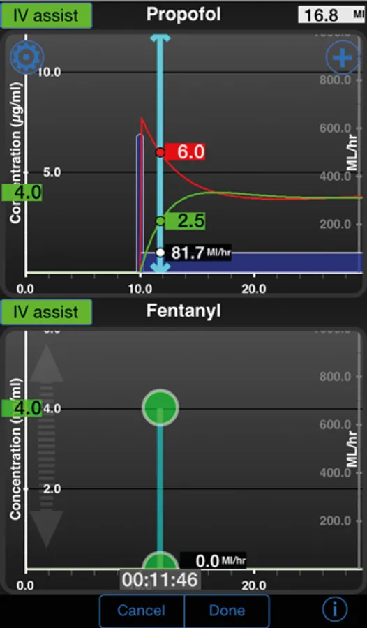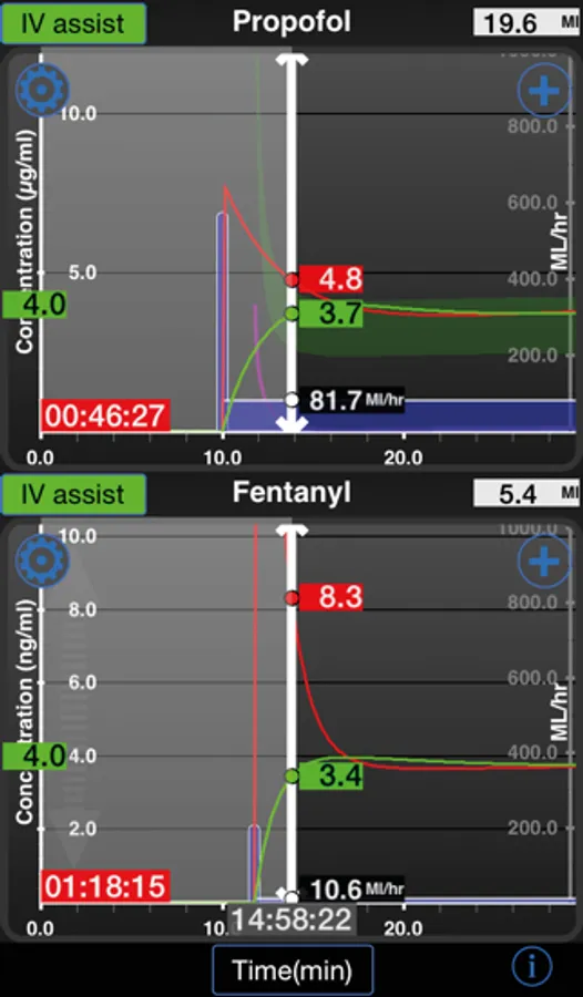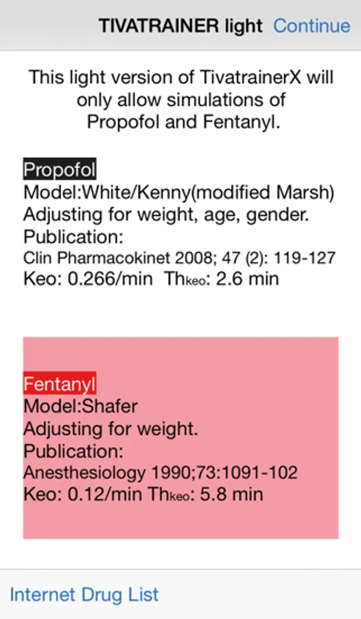 It will simulate blood and effect site concentrations of Propofol+Fentanyl only. The only limitations in this light version are the inability to save data and the possibility to download drug records from the central internet drug database, you can however list the drug records in this database. It will display the interaction between Propofol and Fentanyl and has the powerful IVassist mode that will translate,with adjustable precision, a specific blood or effect site concentration to a bolus and series of infusions. It will show totals of each infusion segment with or without bolus or time to run so you can program your infusion pump for when a segment is ending and a change of infusion rate is required. The IVassist mode can easily be mixed with the manual mode so you will not lose the connection between the dose and the running simulation in case you need a quick bolus. In addition Target controlled infusion can be simulated in blood and effect mode so you can explain your lesser pharmacokinetic grounded colleagues the pharmacokinetic principles of these modern infusion devices.