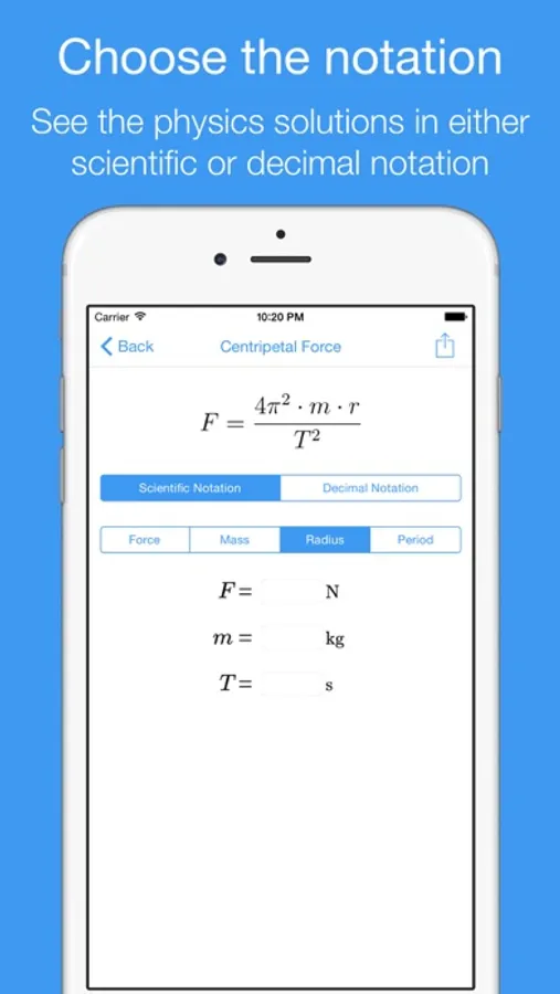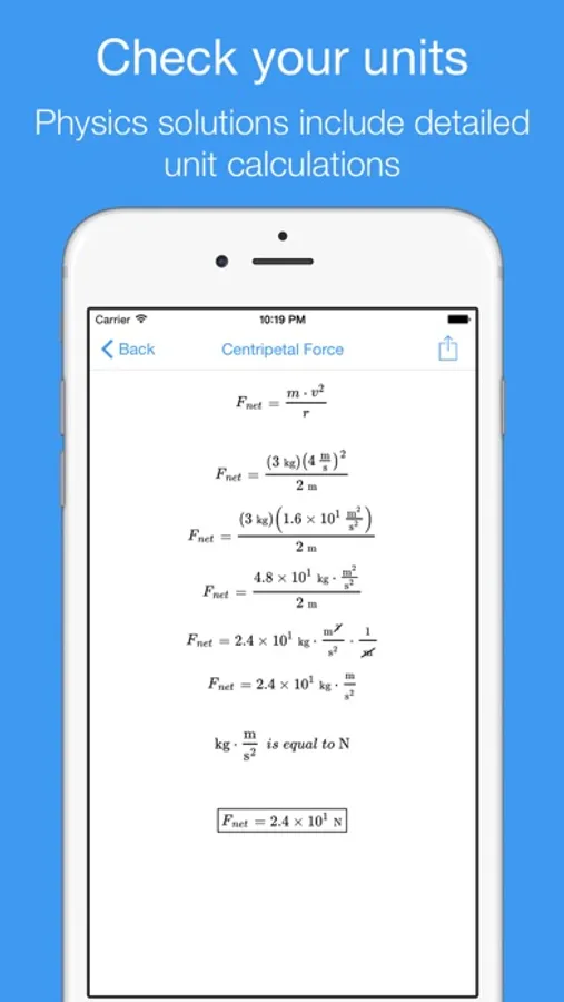 • Physics solutions include all unit calculations and can be displayed in either decimal or scientific notation