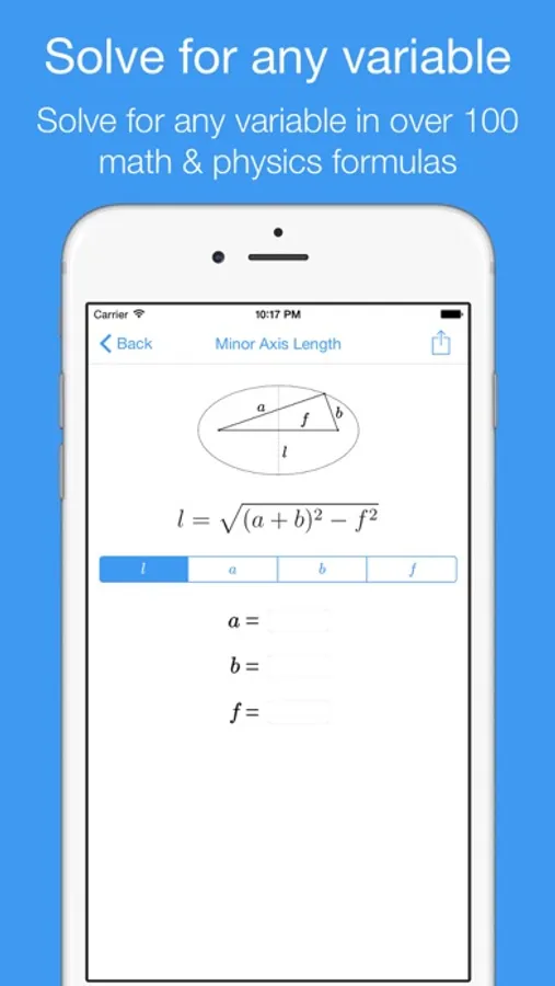• Solves for any variable in over 100 math and physics formulas (and counting)