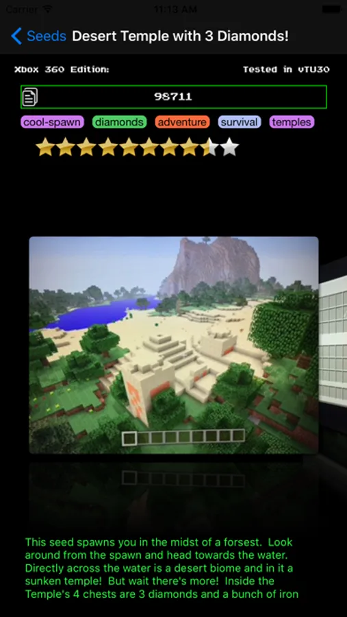 Our Minecraft Seeds are carefully curated, hand picked Minecraft seeds. We test each and every seed before we include them in our app to make sure they work. We only accept the very best, most interesting and unique seeds to add to our collection. If we can't make sure it works, then we don't include it. Simple as that.