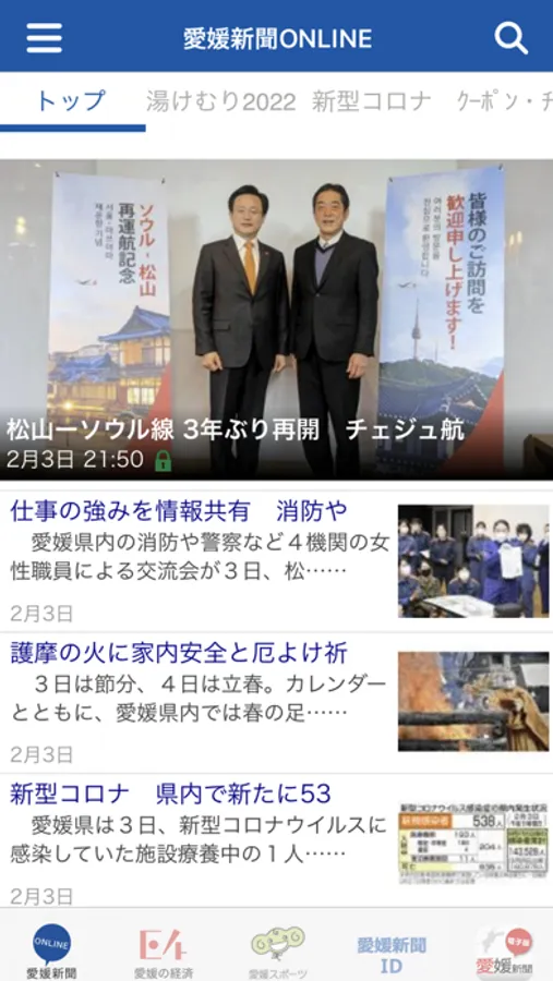 愛媛のニュースや情報を丸ごとチェックできる愛媛新聞ONLINEのアプリです。政治、経済、社会、文化、スポーツなど各分野の動きをいち早くお伝えし、新型コロナや防災、交通といった生活に関わる情報も満載。歩数計やスタンプラリー、お得なクーポンなど楽しめる機能もあります。