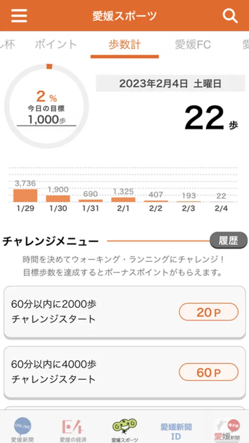 「愛媛スポーツ」の中にある「歩数計」は、歩数に応じて翌日、アプリを開くとポイントを獲得できます。ご自身で設定した目標をクリアした際や、チャレンジメニューを達成した際にもポイントが加算されます。「ポイント」のページで履歴やランキングも閲覧でき、楽しみながら歩いたり、走ったりして、健康管理にお役立てください。