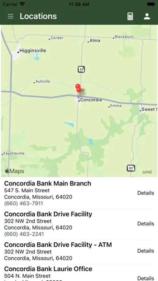 Contact: Locate ATMs or branches and contact Concordia Bank customer service directly from the app.