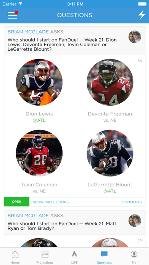 1) Questions - Quick analysis from the real fantasy pros - the fantasy sports fans! Fans can ask, answer, or comment on questions about daily fantasy lineups, start/sit decisions, free agent pickups, or trade opportunities.