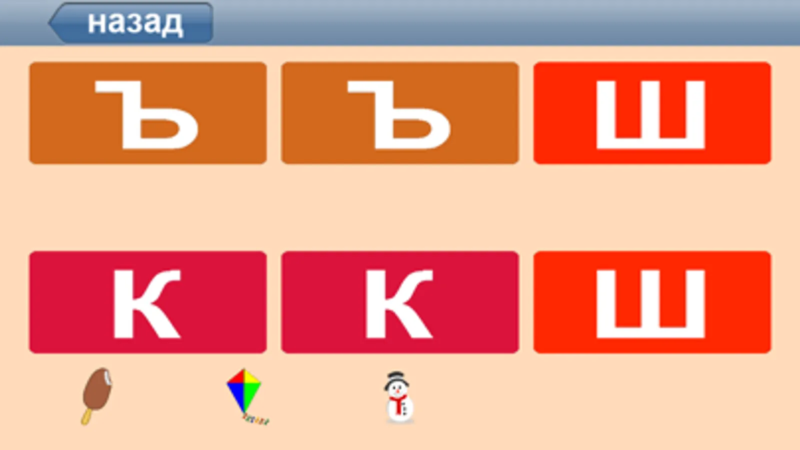 Буквы русского алфавита, цифры или цвета на русском языке.