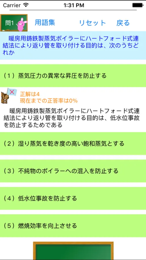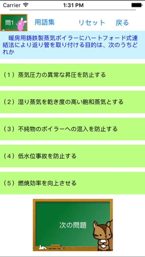 自動で間違えた問題を記憶し、間違えた問題、まだ解いていない問題を優先的に出題します。またセーブ機能がついているため、途中でやめても再度立ち上げた時に続きから問題を解くことができるので、効率よく勉強をすすめることができます(データは各科目ごとにmenuボタンからリセットすることができます)