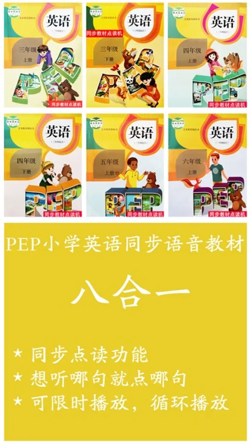 本版本是PEP版,请核对你小朋友的教材版本(可以核对图片的封面)。每个地区用的版本不一样,有的用人教《新版》,有的用《PEP》版,也有的用《新起点》,还有其他的牛津什么的。你要确认你的小朋友是用PEP版本,这个产品是《PEP》版。有同步语音+同步字幕+同步翻译,每个单元分A部分,B部分,C部分,还有单词部分。