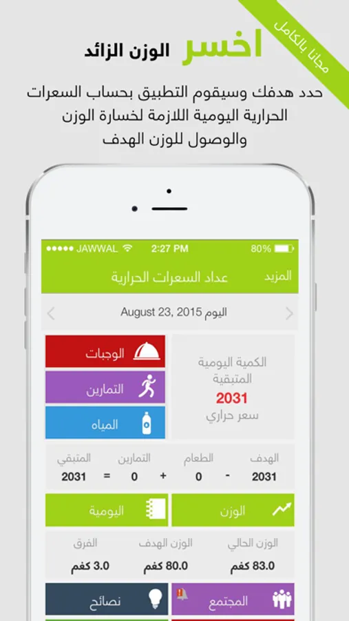 يقوم التطبيق بحساب السعرات الحرارية و المكونات الغذائية الرئيسية بناء على وزنك المستهدف
