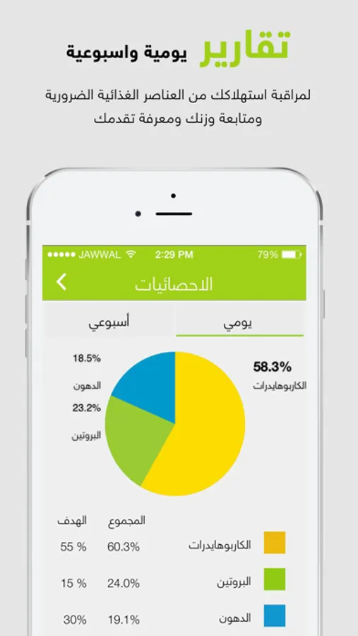 تقارير يومية واسبوعية لمتابعة نظامك الغذائي ما يشمل السعرات الحرارية -كربوهيدرات وبروتين ودهون،