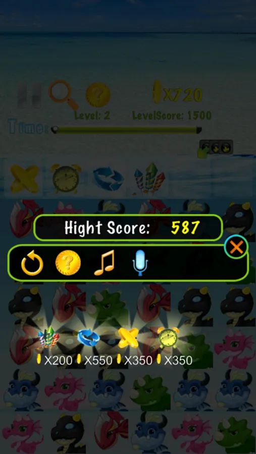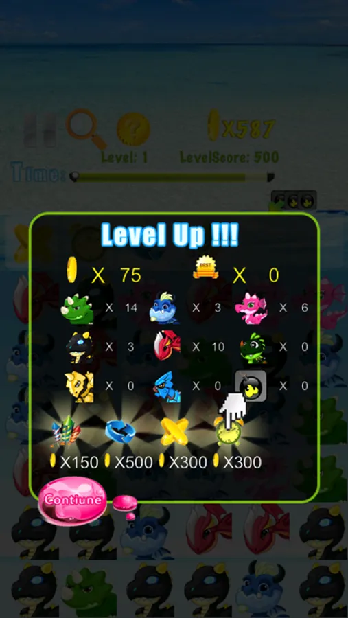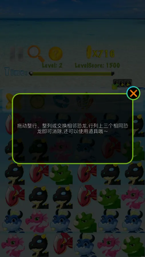 游戏规则:三个以上相同的恐龙连在一起那可消除,可以交换两个相邻水果,也可以划动一行或一列恐龙,到达一定的关卡后,有爆炸道具出现,双击会炸掉周围的宠物。另外还有不同的道具供你来使用,赶快去探索吧~