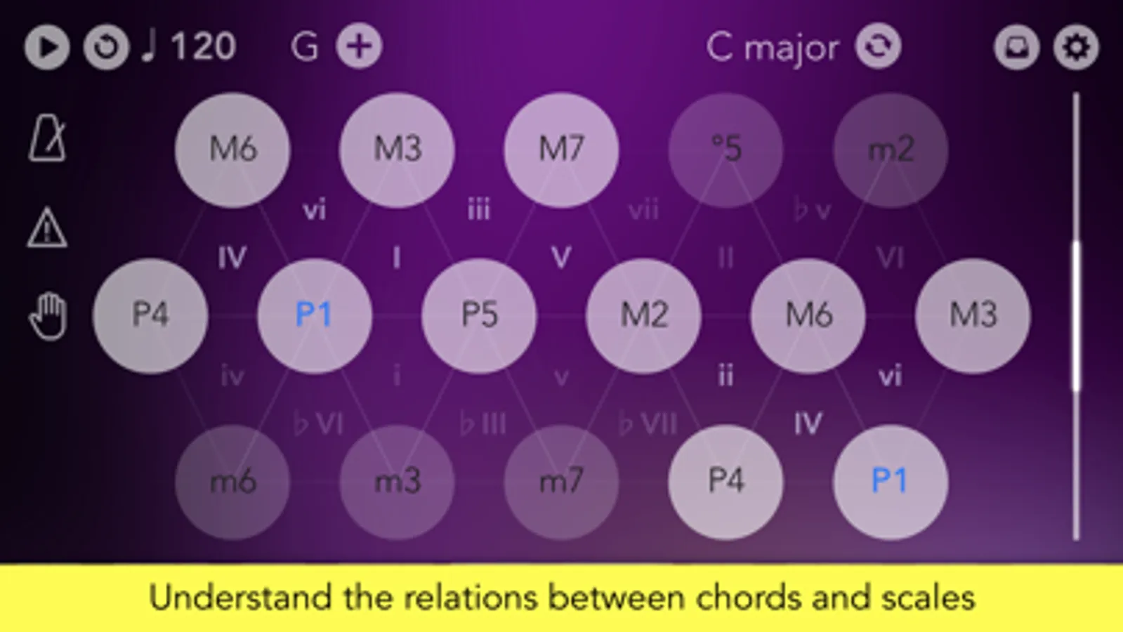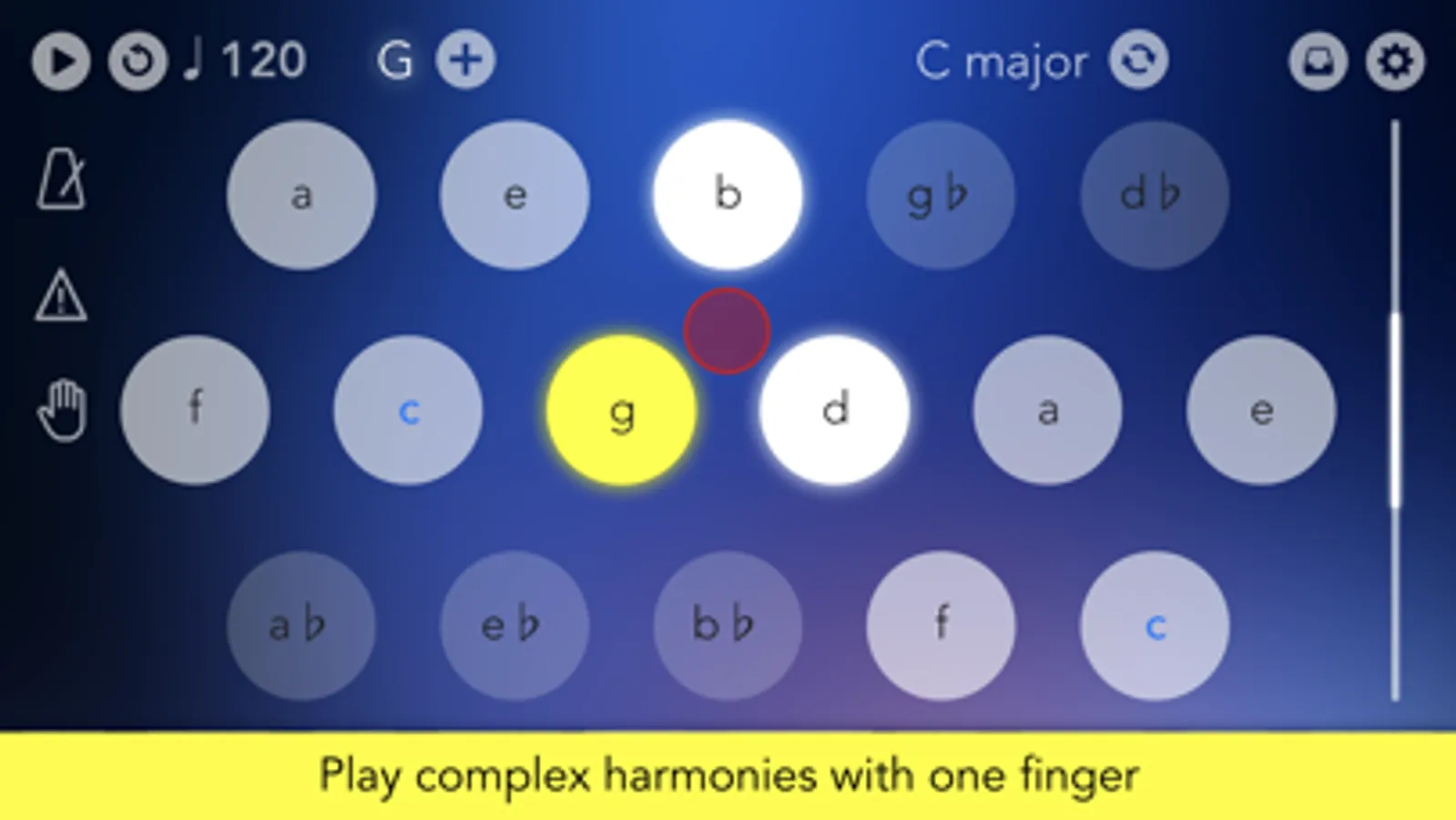 "Find using the harmonic grid more intuitive than a piano keyboard, being able to press in the middle of three circles to get major and minor chords is genius. Experimenting with chord patterns and having the chord name at the top and the root and other keys displayed on the keyboard, is helping me get my head around more complex chords." - mister-rz