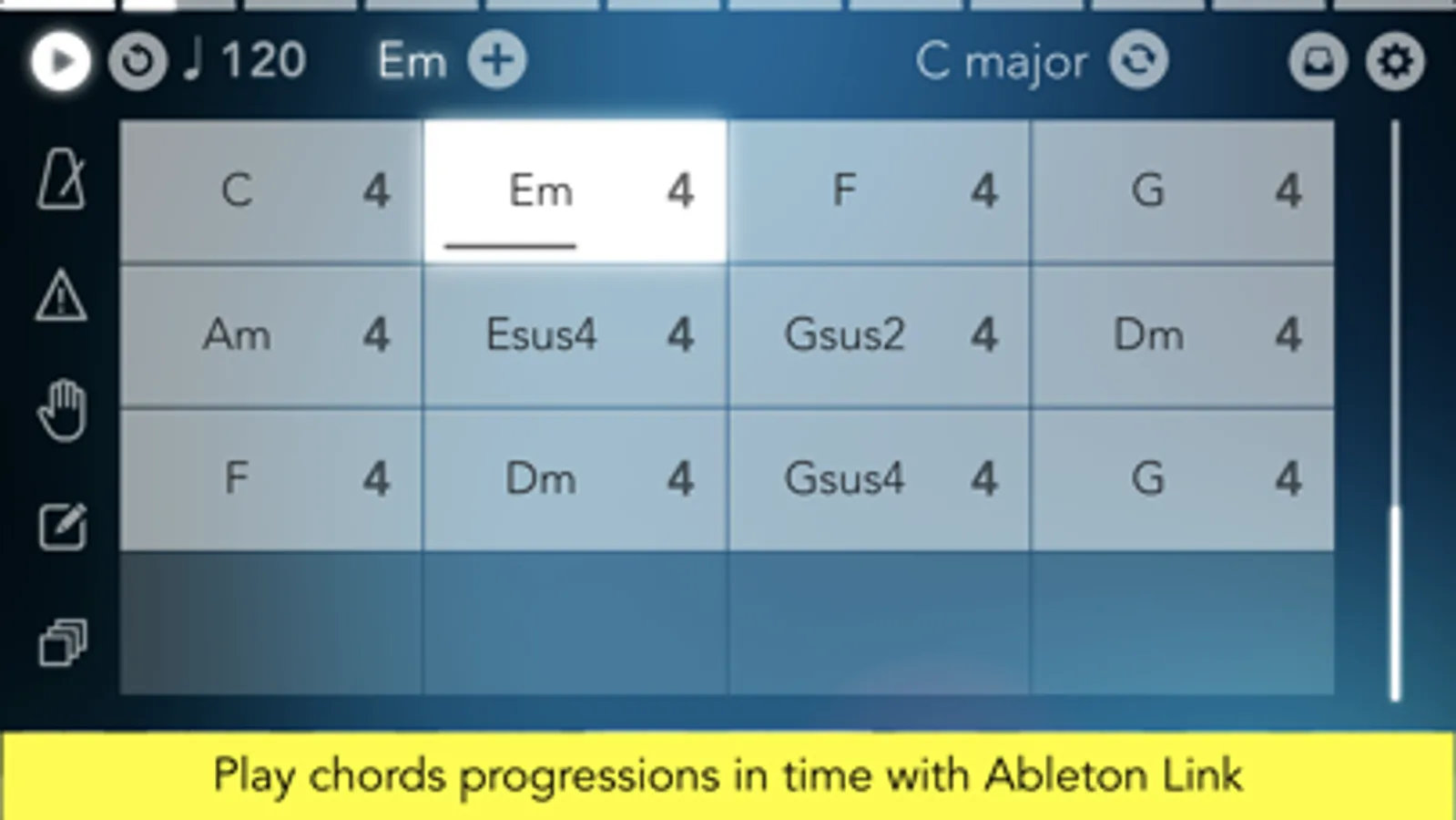 Create lush chord progressions. Loop progressions in sync with other apps. Trigger chords from your MIDI footswitch. Learn relations between chords and scales. Play along on the on-screen piano keyboard. Save chords to pads. Oh, it is also a powerful MIDI controller with every key and pad being a configurable XY pad (full version).