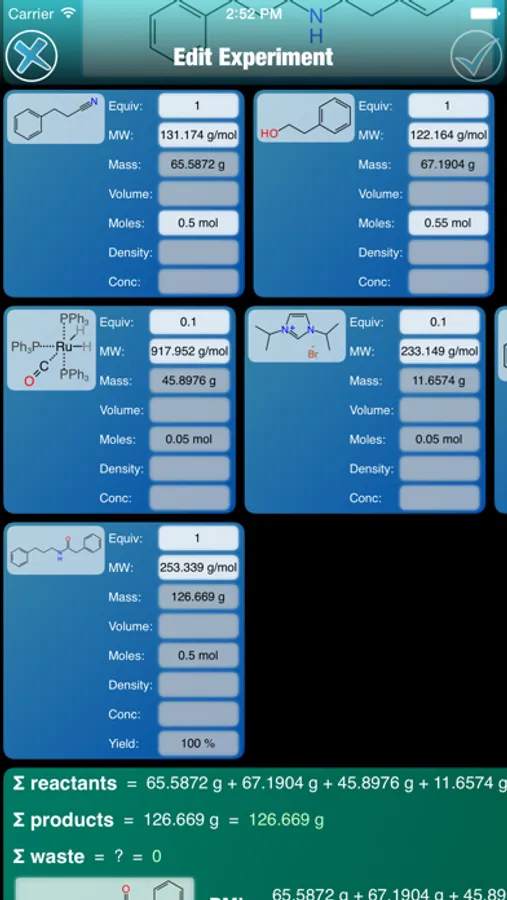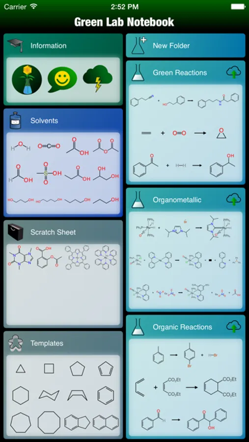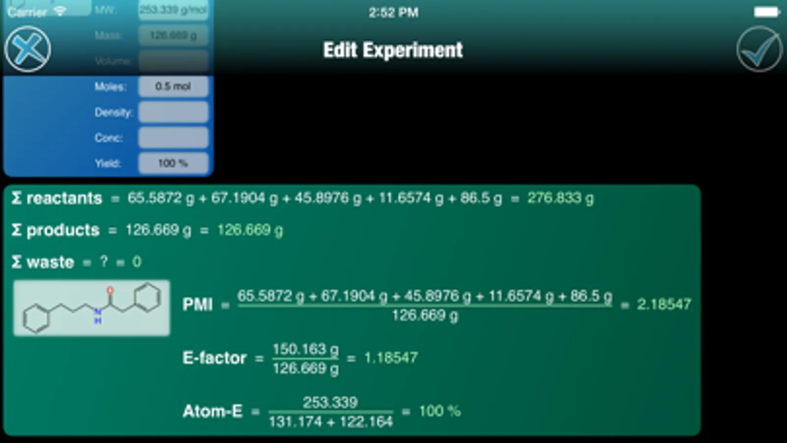 The Green Lab Notebook allows recording of multistep chemical reactions, using molecular structure, name and stoichiometry as the primary components. When quantities are provided, interconversions are calculated automatically, and green chemistry metrics are shown.