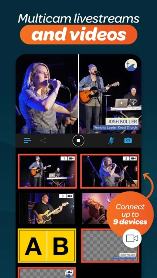 - Connect up to 9 devices for wireless multicamera productions. Customize the look with layouts like grid, split-screen, picture-in-picture, and more.