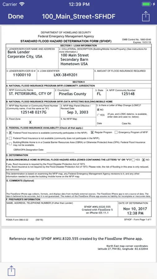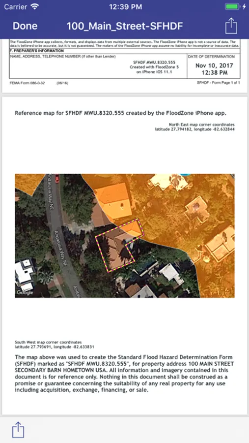 Create the Standard Flood Hazard Determination Form (SFHDF) right on your iPad and iPhone. This is more than what is available on the FEMA site; it automatically completes the SFHDF form including the Community and map panel information, and provides a map showing the property with the FEMA / NFIP overlay!