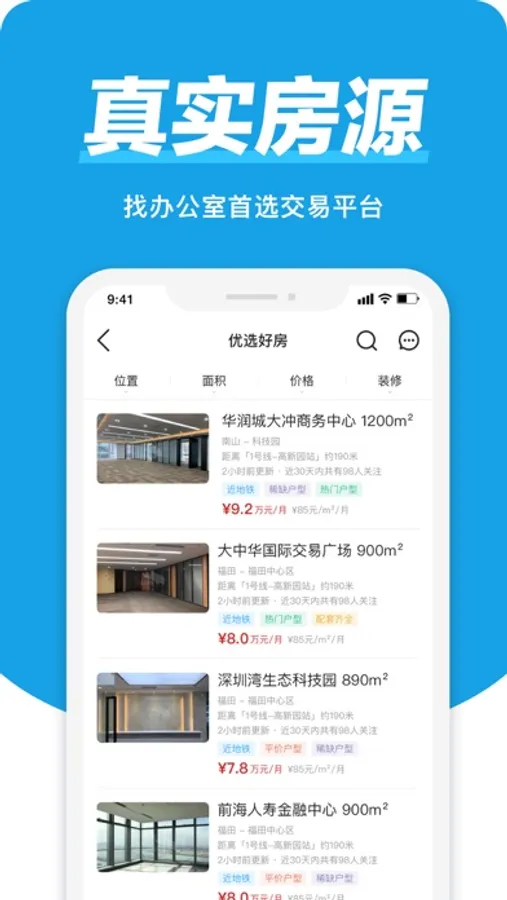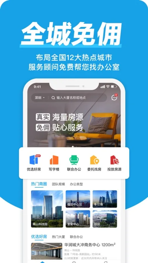 点点租以提升企业用户租赁体验和找房效率为核心原则,拒绝任何虚假和低质量的写字楼信息,真实精选房源。 通过“线上选房-智能匹配-陪护看房-撮合交易”的标准流程,为用户提供贴心的租办公室服务。与此同时,为了在业主方和企业租户之间搭建了快速服务通道,点点租直接与众创空间、联合办公、孵化器、商务中心、产业园、开发商合作,并通过室内摄影、室内全景、街景、地图找房等模式,在移动端APP和PC端,提供全新的360°看房体验,提供专业的选址服务。