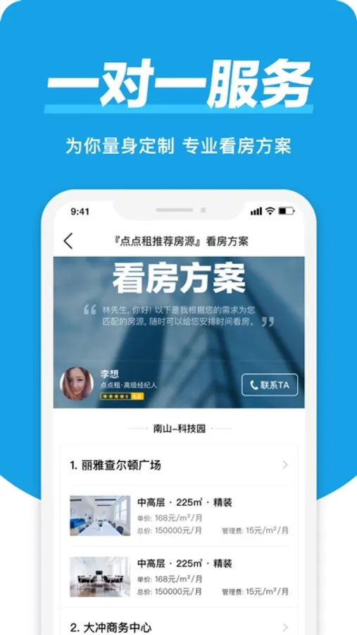 找点点租之前,我还找了4个其他的写字楼中介公司带我看办公室,最终还是选择了与点点租签约,因为服务更贴心,推荐的办公室更合适。