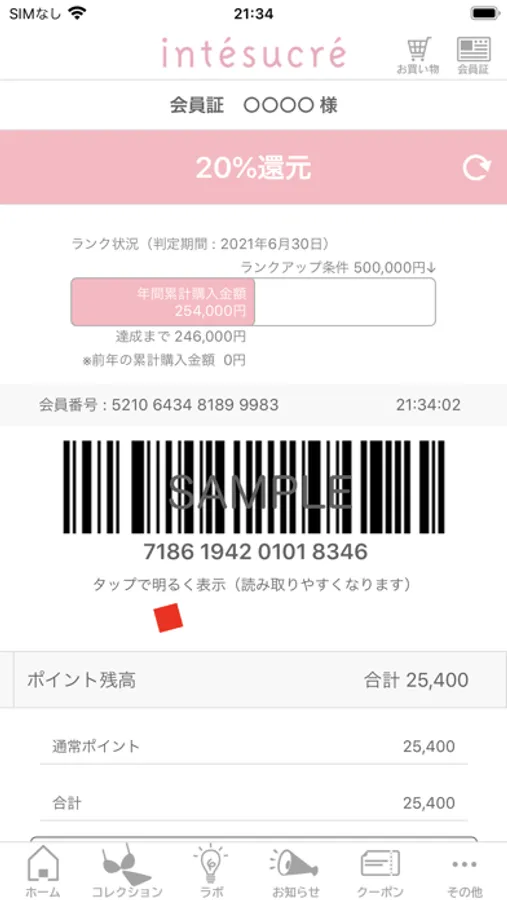 会員証の表示・管理のほか、ポイント残高&利用履歴、購入履歴等の情報が確認できます。