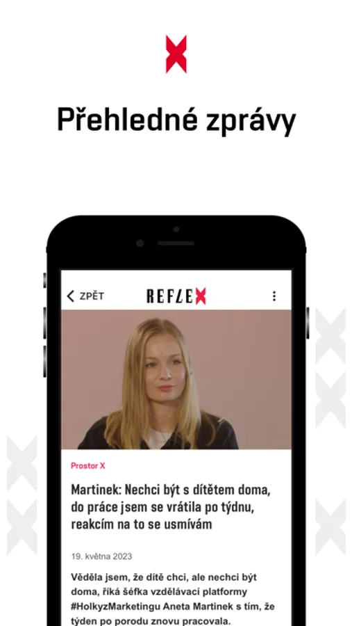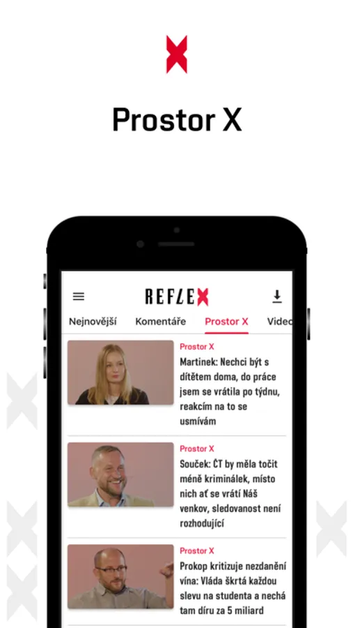 Nejnovější zprávy, rozhovory Prostor X, názory, komentáře a glosy přináší aplikace Reflex. Aplikace každý den provází aktuálním domácím i světovým děním. Na jednom místě najdete mnoho informací z více oblastí (kultura, historie, cestování, věda a zajímavosti).