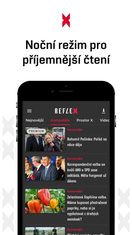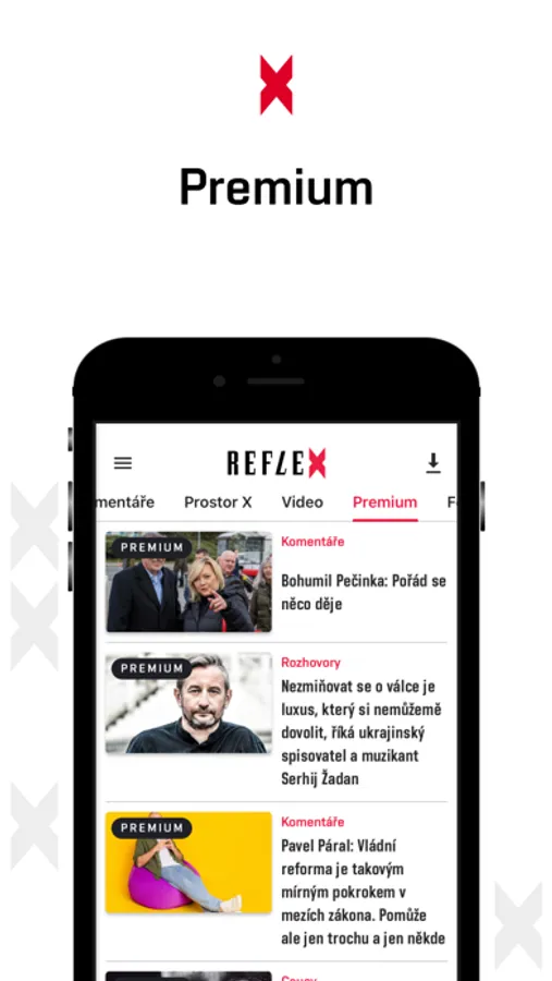 Aplikace přináší bezplatný obsah webu reflex.cz a zároveň nově možnost zakoupení placeného obsahu Premium X.