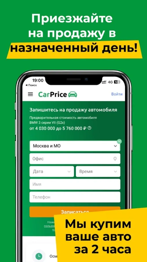 CarPrice – это приложение для быстрой и безопасной продажи автомобиля. Установите приложение на телефон, запишитесь на бесплатный осмотр авто в удобное время в ближайшем офисе компании и продайте свой автомобиль в течение 2 часов.