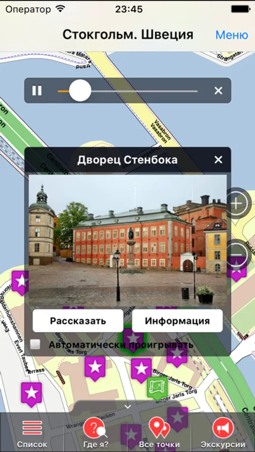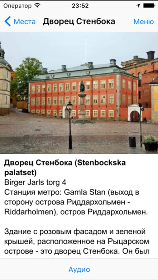 ● АУДИОГИД ПО СТОКГОЛЬМУ. Рассказы аудиогида озвучены профессиональным диктором. Слушайте рассказы, не отвлекаясь от осмотра достопримечательностей и не теряя время. Не стоит лишний раз портить зрение, читая на ходу текст на небольшом экране.