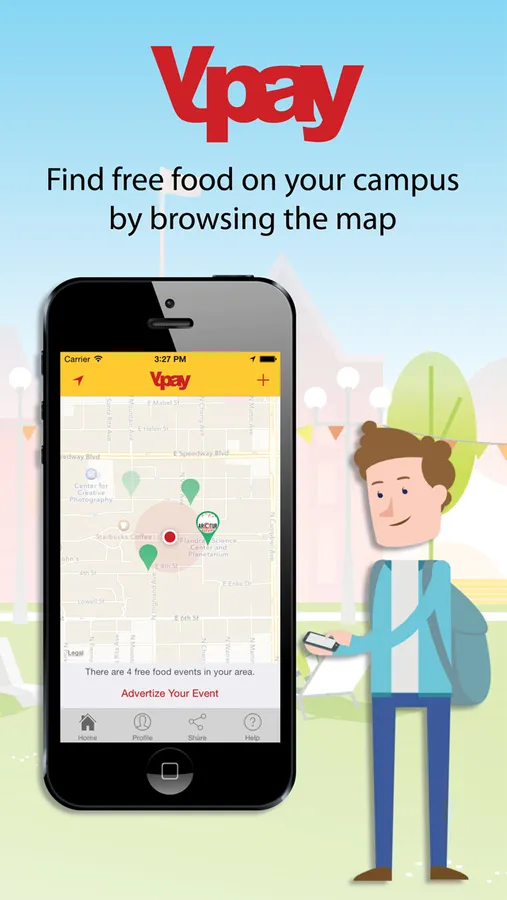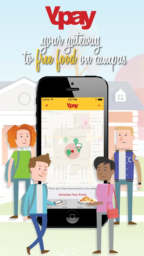Ypay is the first free-food-event-finder app, developed just for you. It works as a community based app where its users are able to upload free food events that they see. We like to think of ourselves as the “Craigslist for free food events”. Ypay is beneficial for both college students and event organizers. When you discover a free food event you are able to share the location with the Ypay community, and at the same time, event organizers are able to promote themselves to specific student groups. Using a carefully designed algorithm Ypay sends you a push notification when a free food event is held at your campus, or you can simply use our interactive map to find out if there are any free food events close to you.