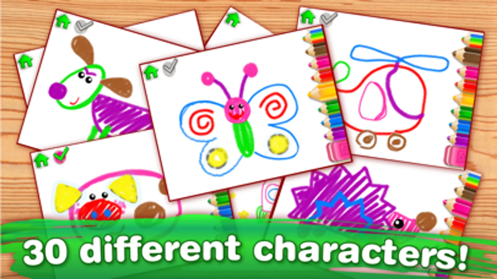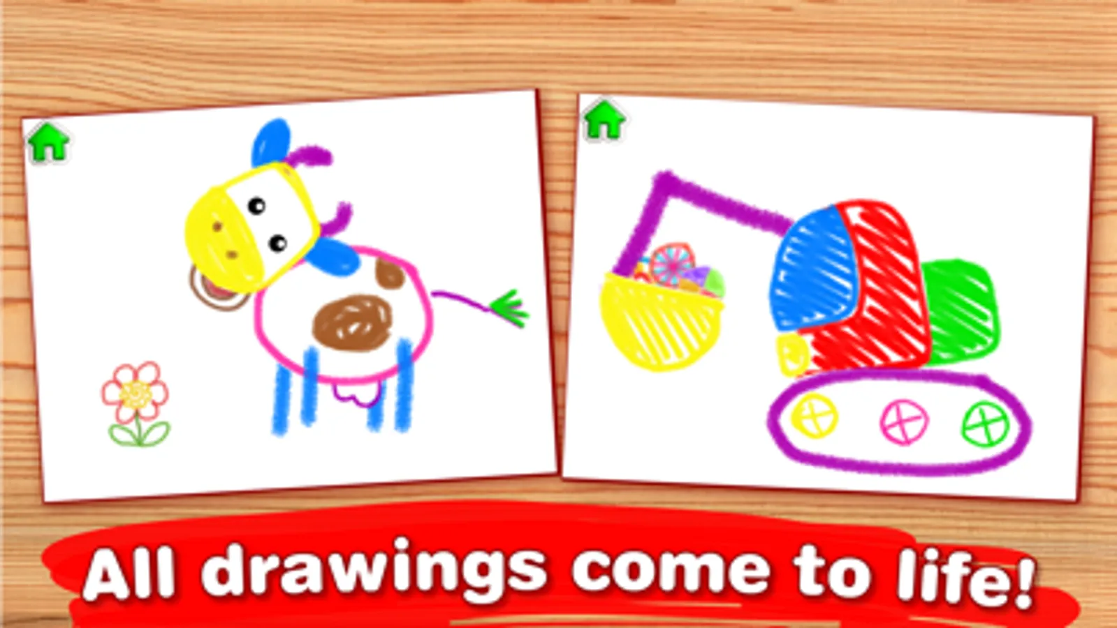 Your child can draw charming characters such a butterfly, a frog, a car and many other objects. Every character comes to life after you finish drawing it.