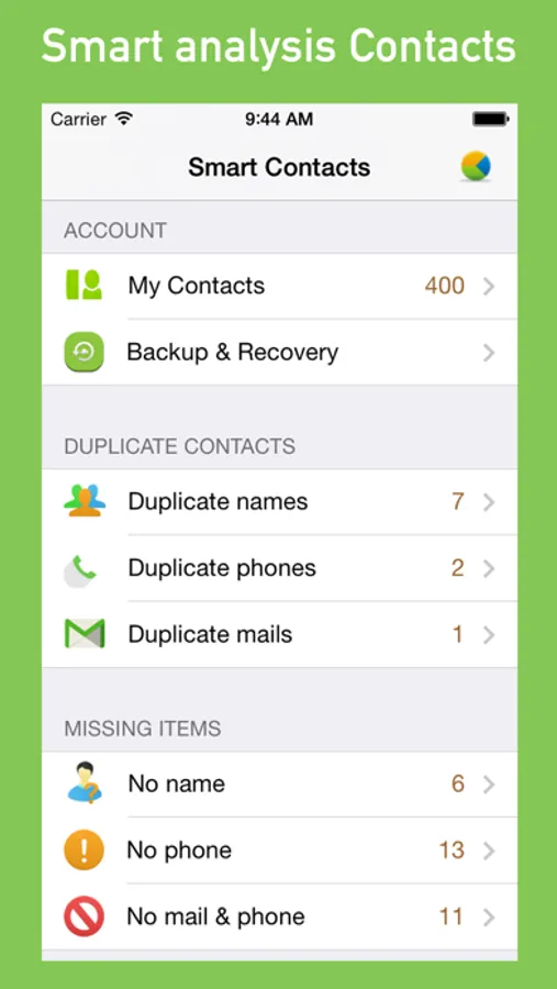MyCleaner will smart analysis your contacts, including the contact's name, phone, eMail, etc., and the results have been showing of chart.