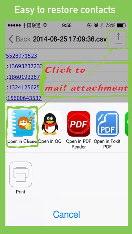 If you change the phone, You can also be in the mail (or any other program to save the backup file) to open the backup file, select "Open other programs" - After the "Select" MyCleaner ", associated with the program, MyCleaner will automatic analysis of records, and imported into the address book.