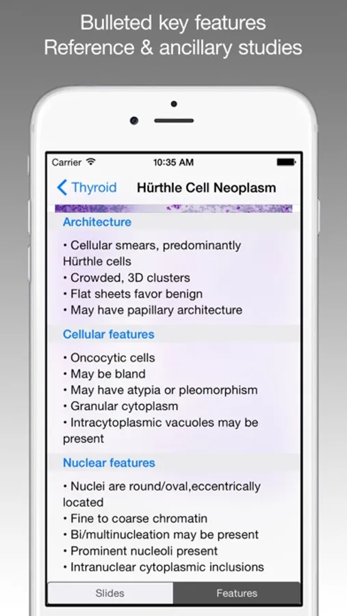 - Key morphologic characteristics including architecture, nuclear, and cytologic features