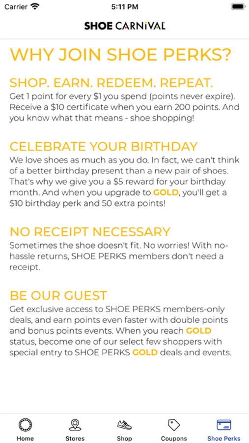 Rewards at your fingertips! Sign up for our Shoe Perks Rewards program to start earning points and receive exclusive offers. Existing Shoe Perks Members can use their virtual Shoe Perks card, view current points and redeem rewards when in store or shopping online.