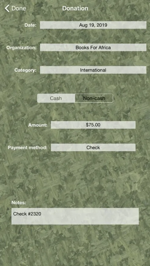 Then enter your donations as you make them throughout the year. You can enter both cash and non-cash donations, and you can add notes to provide additional details about your donation.