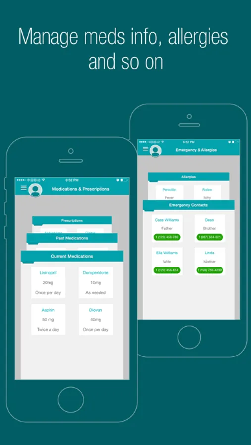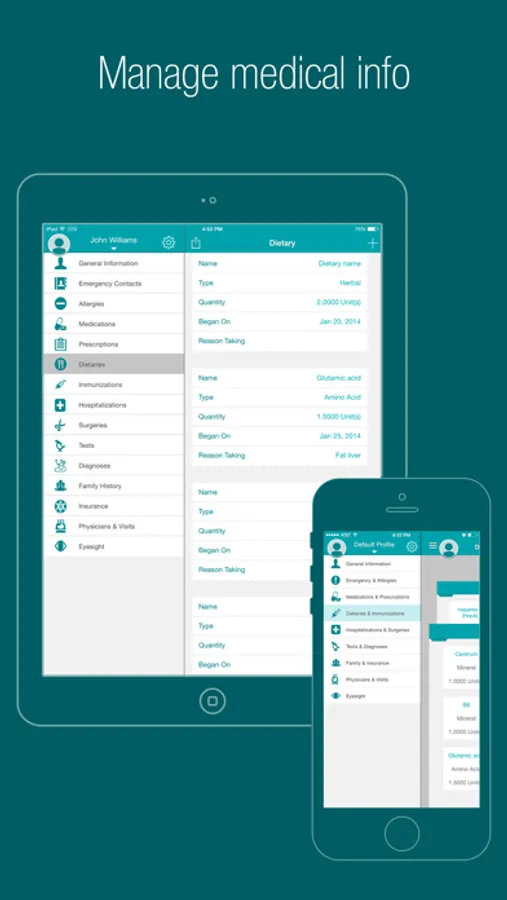 What you can save into this app will surprise you: general basic info, emergency contacts, allergies, taken medications and logs, prescriptions, dietaries, immunizations, hospitalizations and surgeries logs, diagnoses, tests, family info and insurance, physicians and visits plan, and eyesight.