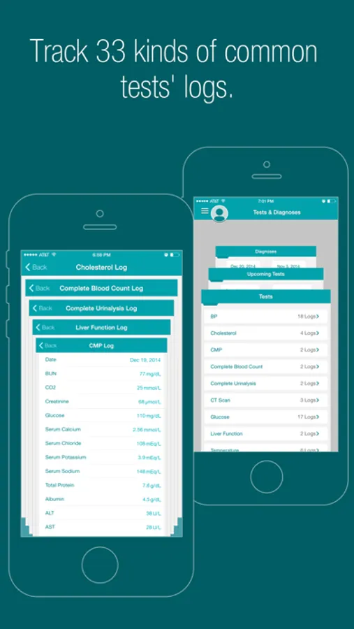 For the test logs, you can add test like, blood pressure, glucose, bone density, cholesterol, chem-7, CMP, colonoscopy, complete blood count, complete urinalysis, CT Scan, EEG, EKG, Endoscopy, Ferritin, Weight, Temperature, Height, Hemoglobin A1c, Immunoglobulins, Kidney Function, Liver Function, Mammogram, MRI, PET, Prothrombin Time, PSA, Routine Urinalysis, Spirometry, Thyroid Function, Total Iron Binding Capacity, Ultrasound and X-ray.