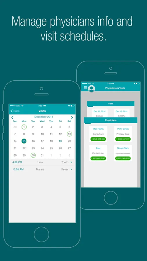 ⁃ Visits: Time, doctor name, purpose, question, outcome and reminder.