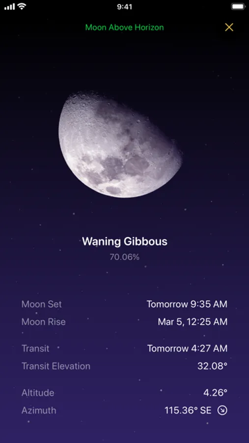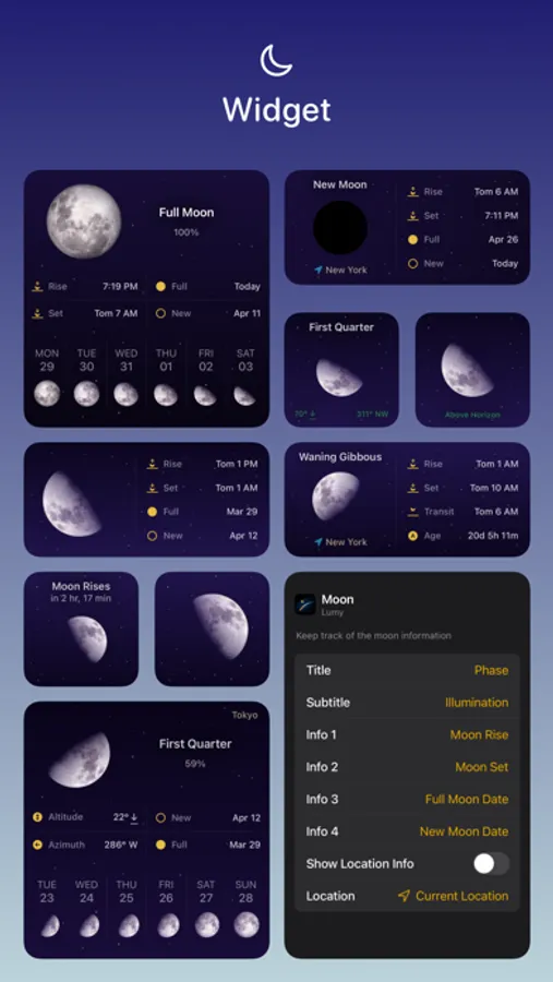 Moon Information Available - Moonrise, Moonset, Altitude, Azimuth, Transit, Transit Elevation, Weekly Moon Phase, Next Full Moon, New Moon, First, and Last quarter information.