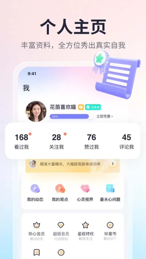 真实:实名身份认证+严格资料审核,只为给你创造最安全靠谱的征婚交友环境