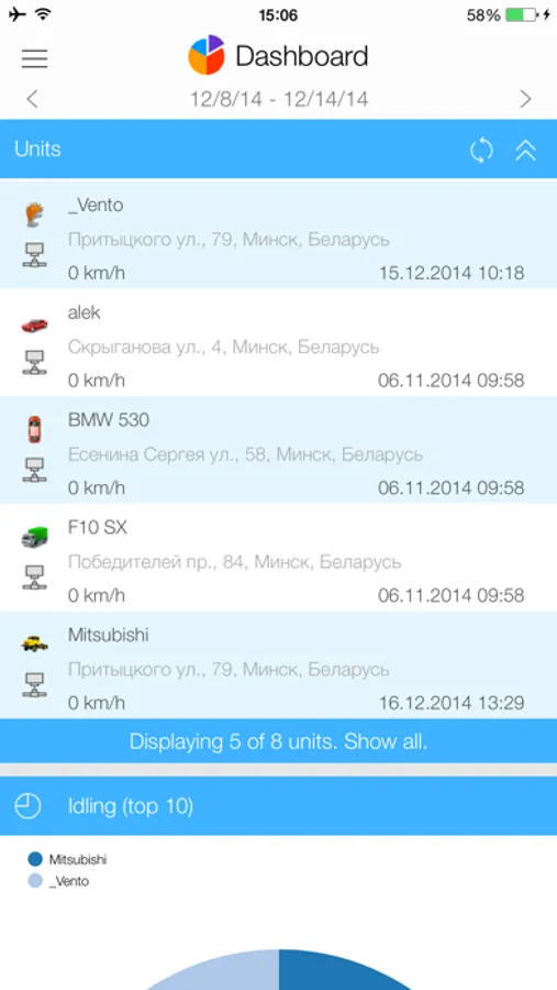 Dashboard is an easy and effective application for viewing visual reports about your fleet performance. It allows to display and analyze graphics created in web-version of Dashboard for Wialon Hosting based on KPI’s (Key Performance Indicators) of the tracked vehicles. Main parameters, such as: mileage, fuel consumption, motohours, average and maximum speed, idling time, travel time, visiting of geofences — are presented in graphics. You can build them according to units (vehicles tracked) and unit groups. You can also choose the graphic type you like — linear, circular or bar charts are available.