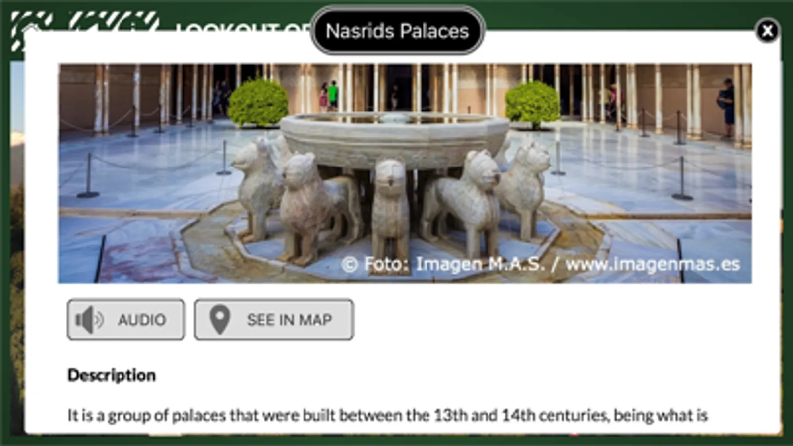 Intuitive and easy to use, the application shows you information about the most attractive places and monuments of Granada through simply enlarging the image with your fingers and tapping on points of interest and their labels.